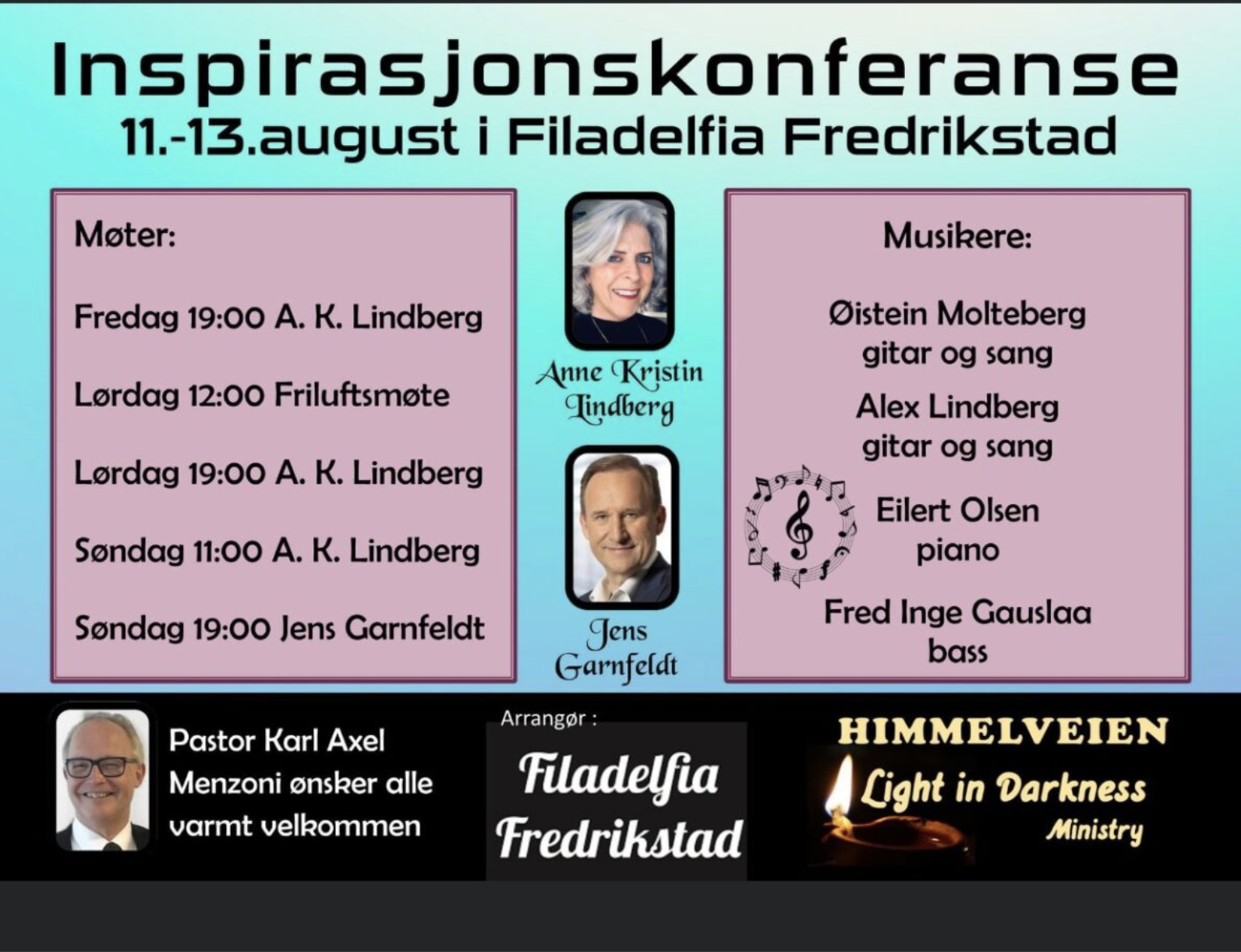 I gudstjenesten taler pastor Karl-Axel Mentzoni. Det er Anette Augdahl som leder lovsangen sammen med Gro og Alexander Mentzoni.